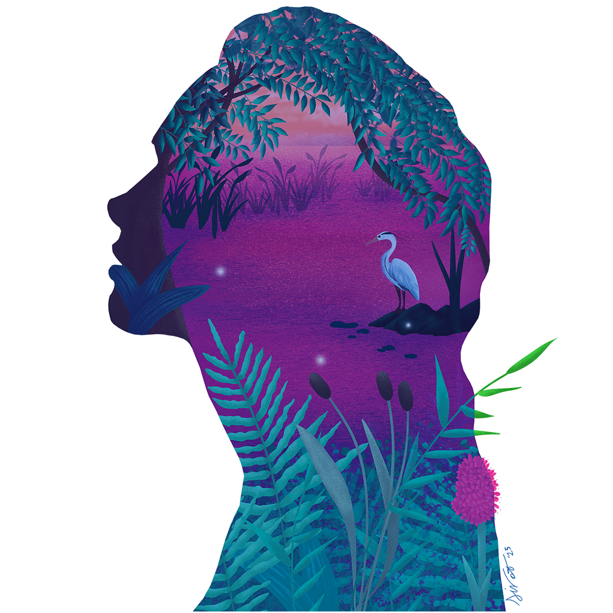 In this illustration, I wanted to incorporate some of the book’s most symbolic elements: the heron, the fireflies, the ferns where Kya used to hide, and the waters of the lagoon she navigated in her little boat.