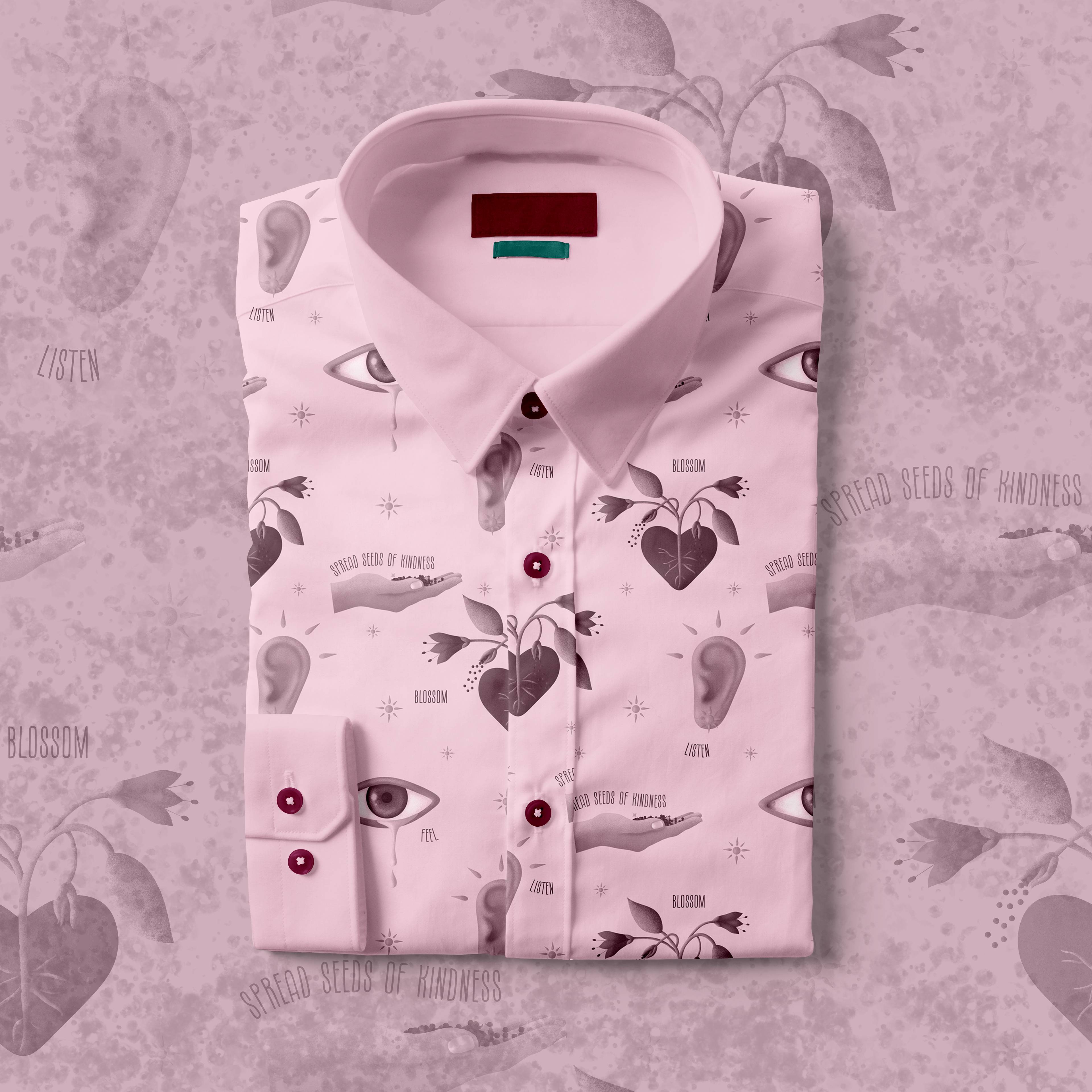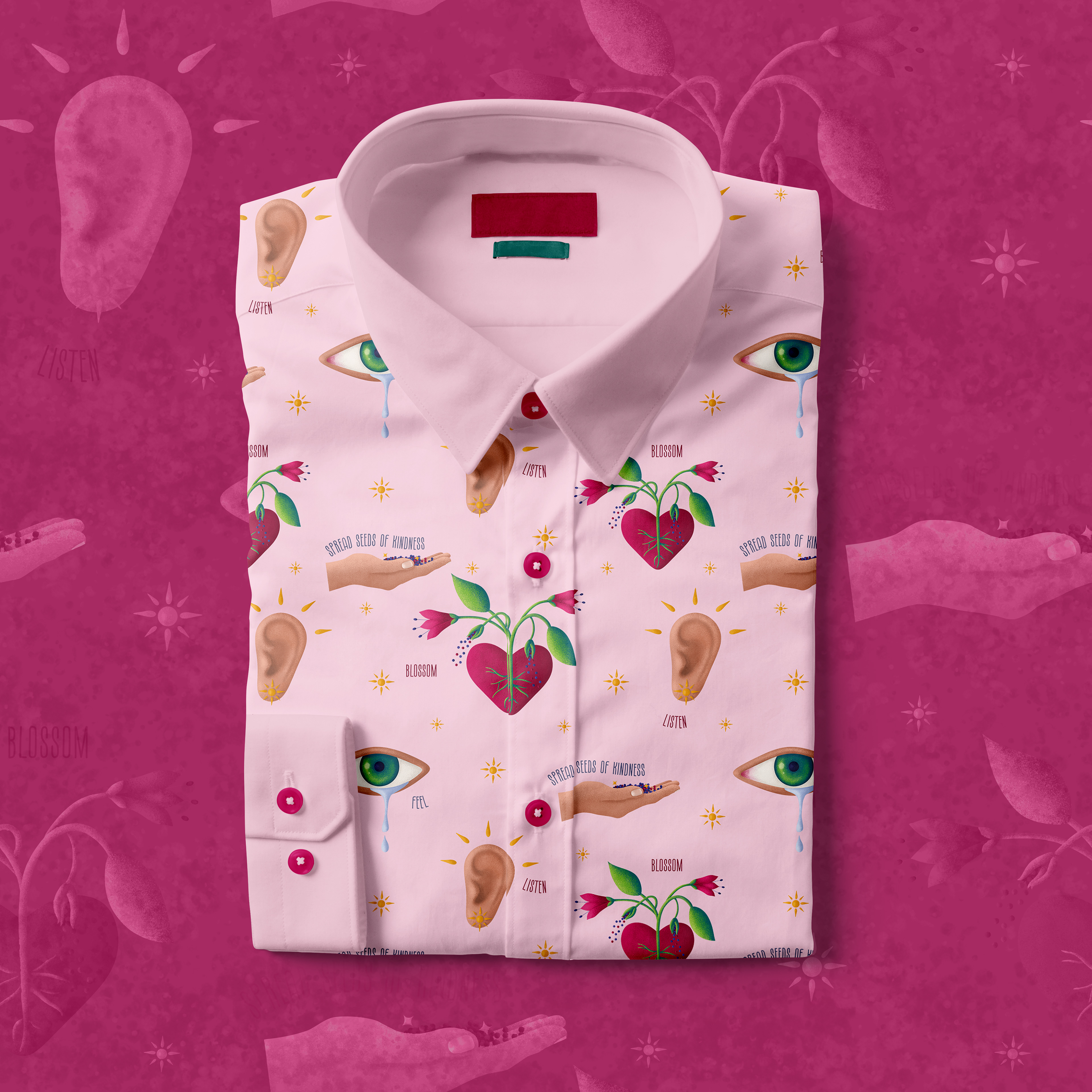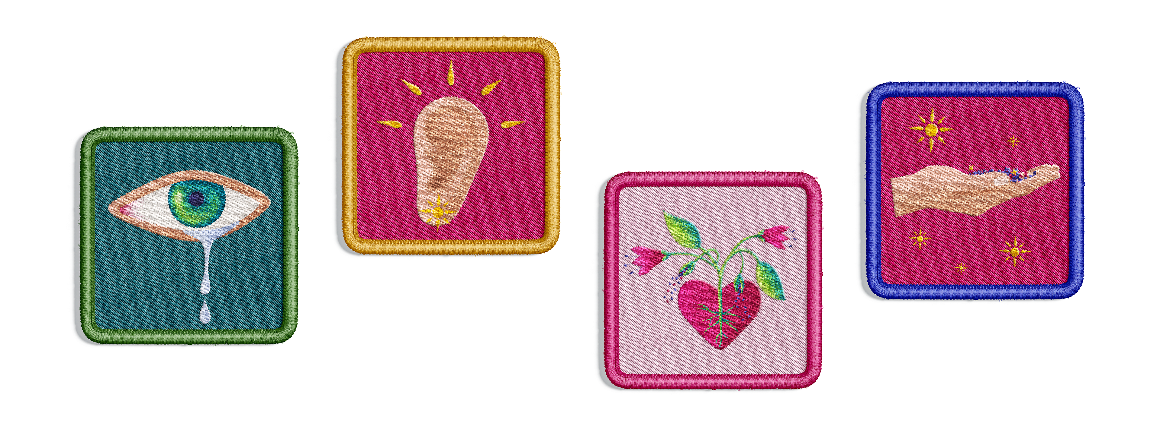 I imagined this composition as a message and I created seamless patterns and icons that could work across different products. I love these shirts and patches!